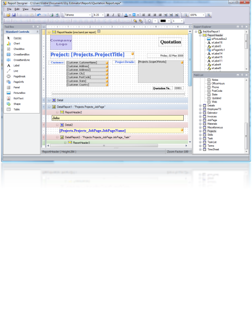 With Ezy Estimator you’re not tied to a limited set of generated reports because you can build your own with the Ezy Report Designer. In the Designer you can build a report template from scratch, edit an existing template or use one of the many pre-built ones. Simply add pictures, charts, labels, etc. and have them display the information you want. When you’re done just save your template and it’s there for the next project.