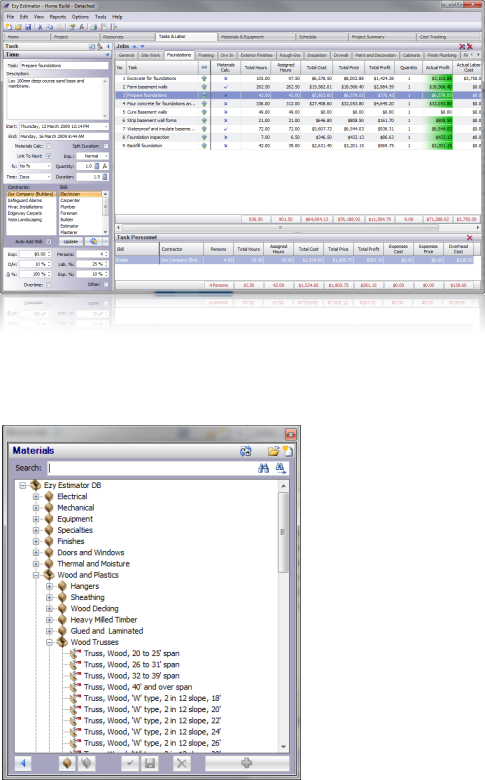 The Tasks and Labor tab shows all the jobs, tasks and skills in a Project. Here the ‘Foundationstab is selected in the Jobs module and all the tasks that are required to complete the job are listed. The Task Personnel shows 4 persons of the ‘Builder skill type have been assigned to the highlighted task ‘Prepare foundations The rates for this skill are used for calculating the labor costs for the task. Any number of different skill types can be assigned to a task. Materials can be added to tasks in the ‘Materials and Equipmenttab.
